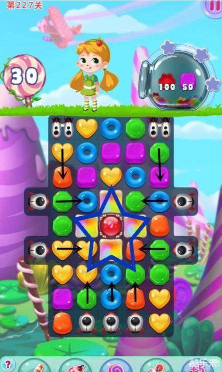 宾果消消乐227关主要任务是收集100个红色糖果和50个紫色糖果,本关除了在几个重要区域下功夫外,同时不要忘了特效的重要性,漩涡特效对于收集糖果的关卡还是相当管用的。黑色箭头是炮弹发射的方向,值得要注意的是在双筒导弹与甜蜜导弹交汇的区域,目标糖果的数量从加2到加5不等,在此区域消除糖果有事半功倍的效果哦.下面我们一起来看一下宾果消消乐227关是怎么通过的吧。