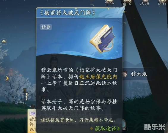 3、材料二:杨家将大破天门阵,来到赵王府葆光院找到含笑对话都选择第一个选项获得。
