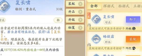 轻剑重击式【复长啸】,轻剑三招连招瞬间叠满四层绝学增伤状态,提伤40%的绝学伤害,注意这也是一种增益状态!技能出自侠客请教马钰。