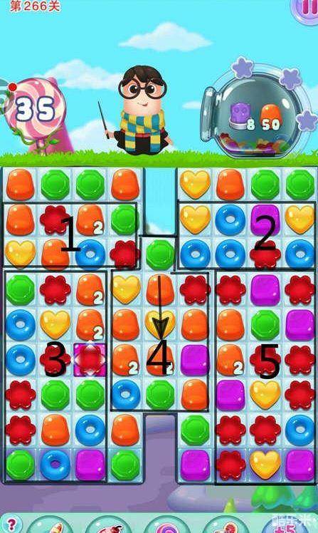 宾果消消乐266关主要任务是收集小象软糖8个、橙色糖果50个。关的首要任务是收集小象软糖和橙色糖果,小象软糖主要在区域1~5这几个区域出现,个人建议还是在特效下消除更好,橙色糖果均由游戏过程随机掉落,不要急于消除它,最好在特效下消除效果更好。下面我们一起来看一下宾果消消乐266关是怎么通过的吧。
