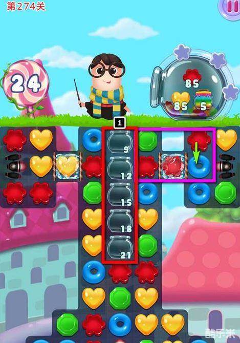 宾果消消乐274关主要任务是收集85个红色糖果,85个黄色糖果,5个彩虹糖罐。这一关必须首先消除巧克力棒,打通超级导弹的辐射通道,增加其通道范围内的糖果数量,这样才能更快地收集齐彩虹糖罐。小编建议尤其是开局前5步就消除所有的巧克力棒,因为这样不仅能通关三星也是不在话下的。下面我们一起来看一下宾果消消乐274关是怎么通过的。
