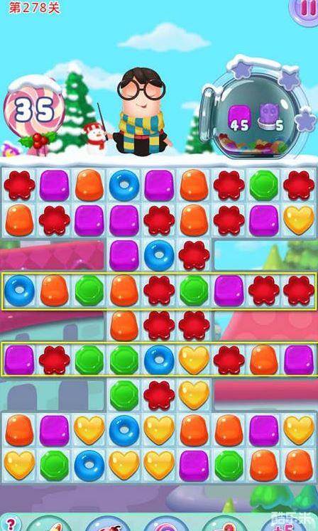 宾果消消乐278关主要任务是收集紫色糖果45个、小象软糖5个。这一关水晶糖不是玩家的任务,获得水晶糖下方的小象软糖才是玩家的主要任务。如果小象软糖出现在图中黄色区域中,建议玩家利用糖果制造横向的特效,这样的话就可以一步消除多个水晶糖,对于玩家来讲省时省力。下面我们一起来看一下宾果消消乐278关的通关攻略吧。