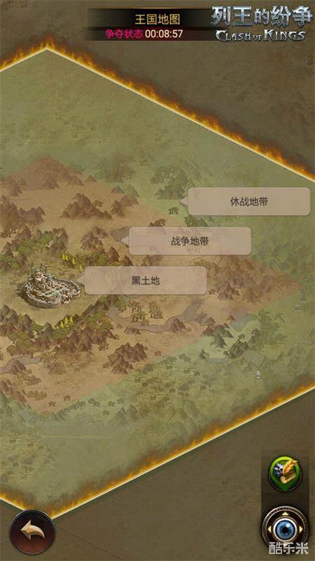 霸主战场地图分为:黑土地、战争地带和休战地带三个部分。在黑土地上,无法进行军队驻扎并且降低行军速度。在黑土地和战争地带上,玩家无法开启“战争守护”,也无法进行灭火、修复城防值,这些操作只有在休战地带中才能进行。
