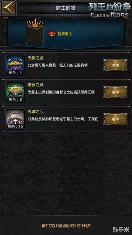 当霸主争夺战结束时,霸主宫殿累计占领时间最长的领主将获得“霸主”称号,并可以行使相应的霸主权力封赏在其疆域内的其他领主。除此之外还将获得霸主争夺战独有且属性强大的装备——霸主套装。