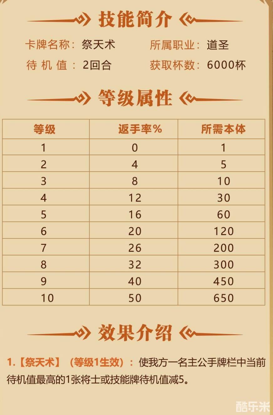角色简评:搭配高待机强力将士牌使用能够使利益最大化,道圣必带的一张技能卡。