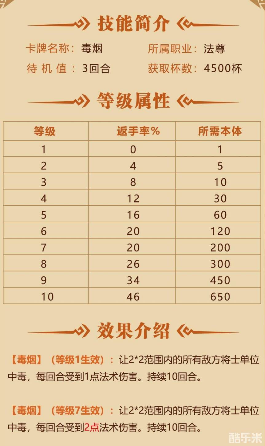 角色简评:对敌方2*2范围内将士增加中毒状态,每回合造成法术伤害,续航能力高。随着技能等级的提升也会增加法术伤害,但是对拥有一定法抗的将士无效。