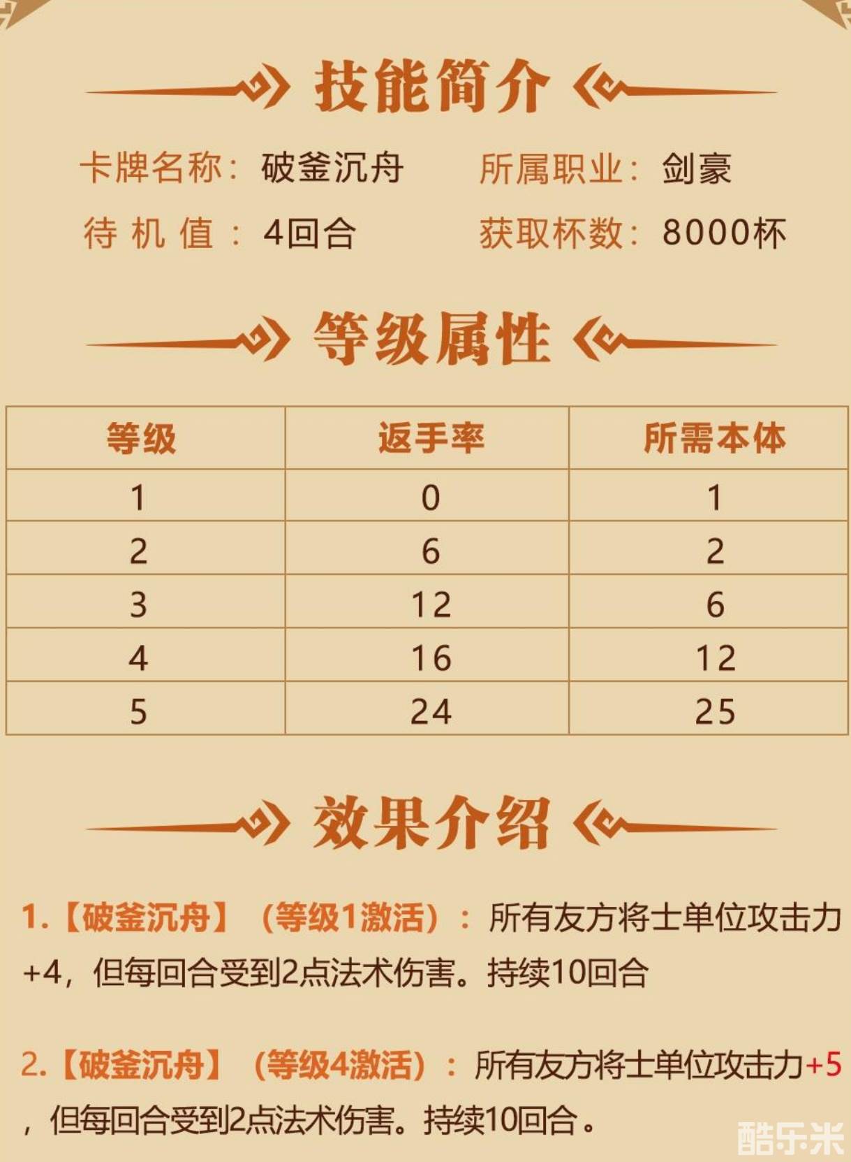 全体攻击buff,在两军博弈中能起到至关重要的作用,能帮助军队打破僵局,打出大量伤害。每回合受到2点法术伤害虽然会持续消耗将士的血量,但是只要主公使用得当,相信破釜沉舟一定能打出超额伤害斩杀敌将!