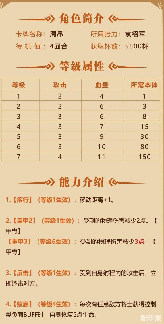 角色简评:周昂本身的定位偏向防守反击,重甲能够让其在近战对局中拥有一定优势。配合带控制类;负面BUFF的卡牌时,能够达到起死回生的效果。