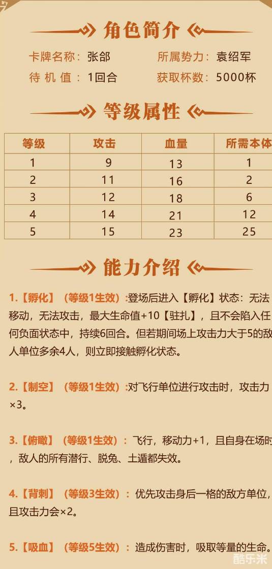 最后编辑于1年前我是小奇兵游戏中按照势力不同分为多个阵营,游戏中角色张郃怎么样?这是袁绍军中传说将士,自身在孵化阶段既有极高血量,若未能成功孵化也能承担较多伤害。今天小编就给大家带来了《我是小奇兵》张郃角色图鉴分享,包含该卡牌角色的属性、技能等信息,想要了解详情的可以来看看哦!