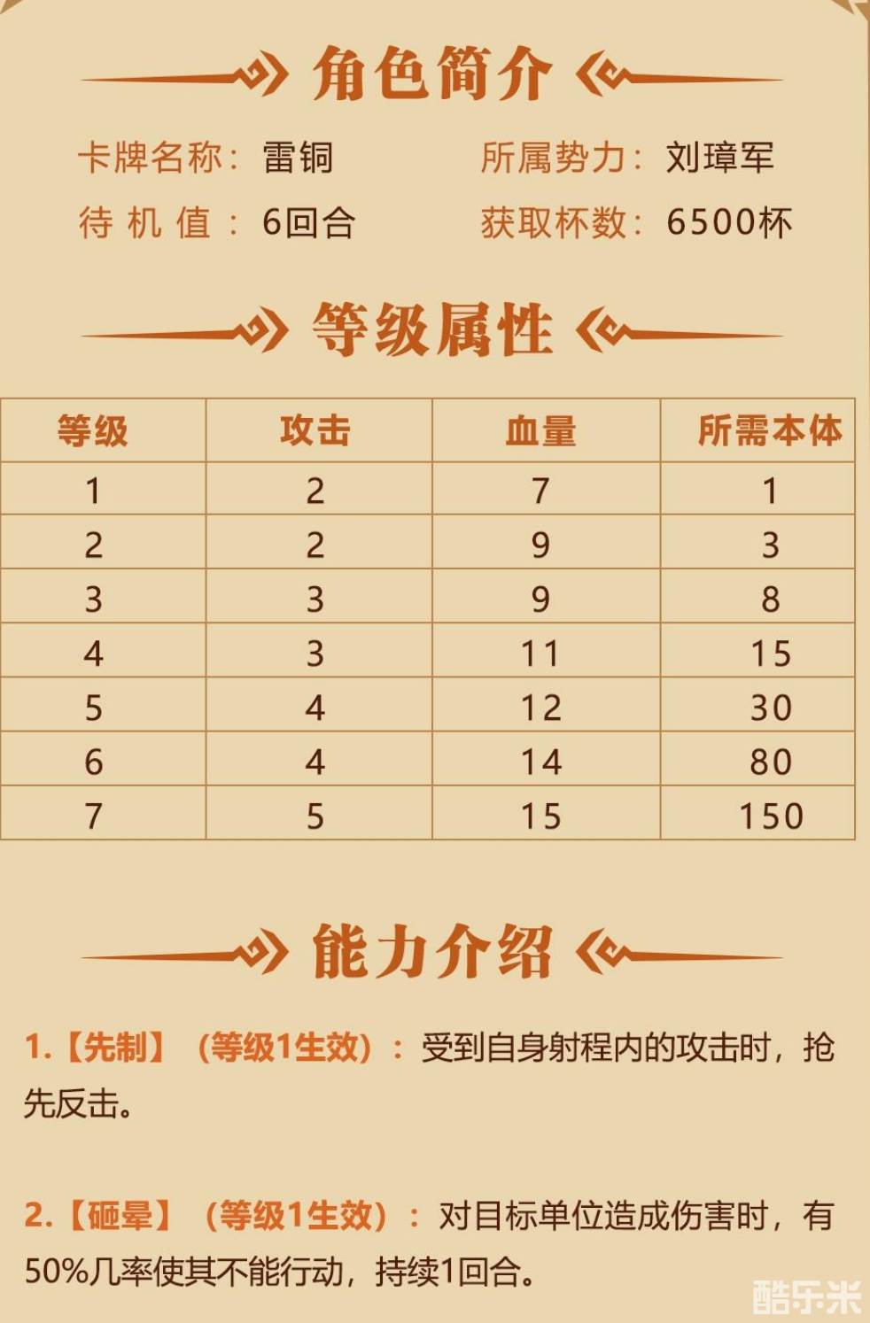 角色简评:高血量配合特殊的抢先反击+概率整晕机制,让这张将士卡在近战对战中所向披靡,若对方没有远程角色的情况下,是让其极为头疼的存在。