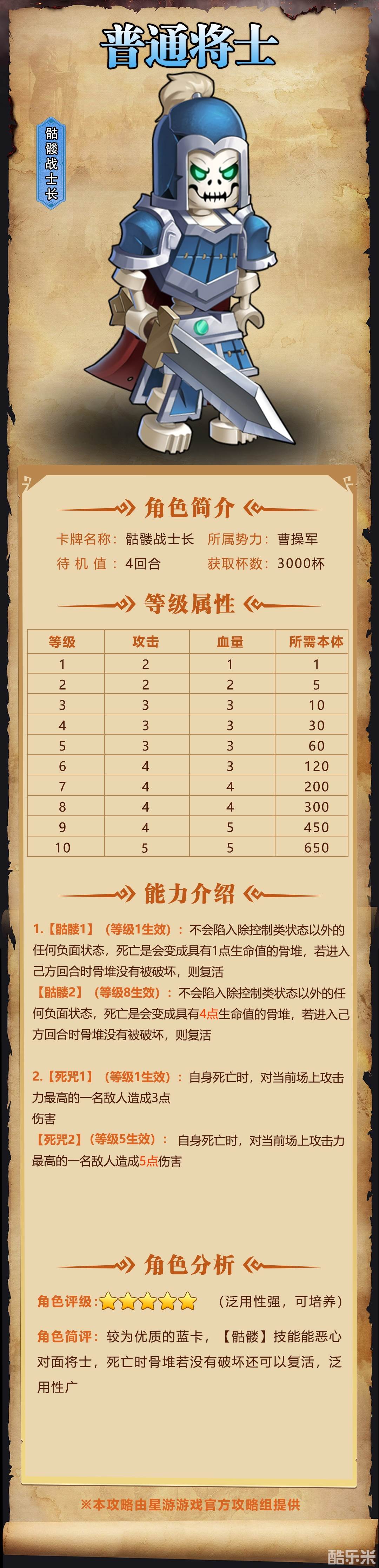 角色简评:较为优质的蓝卡,[骷髅]技能能恶心对面将士,死亡时骨堆若没有破坏还可以复活,泛用性广