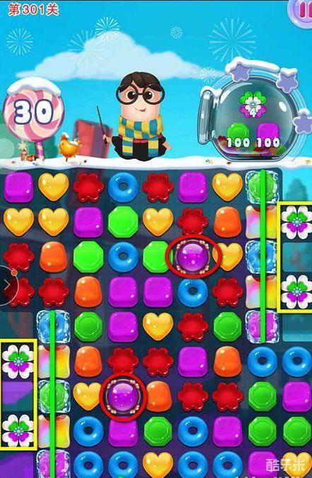 宾果消消乐301关主要任务是获得4个四叶花,以及绿色、紫色糖果各100个。本关的主要操作区域在红色圆圈部分,有了变色水晶球的存在,我们更容易形成目标颜色的糖果。但是一定要时刻注意变色水晶球周围的糖果颜色,不要在紫色多的时候变绿色,不利于魔法特效的形成。下面我们一起来看一下宾果消消乐301关的通关攻略。