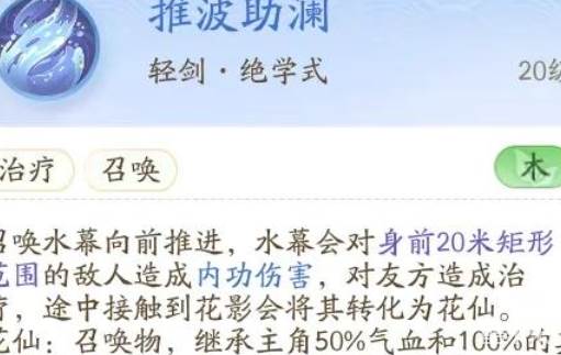 召唤水幕前进。水幕会对你前方20米矩形区域内的敌人造成内伤并治疗你的朋友。如果途中接触到花影,它就会变成花仙子。