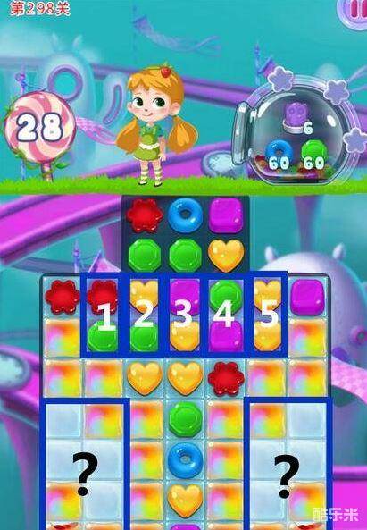 2. 本关的难点在于收集小象软糖,而且是画着“?”区域的小象。1~5区分别分布着1只小象,这几只小象还是很容易收集的。下半部两个区域之所以画着“?”,是因为每局小象的位置随机,有可能在左半区的“?”位置,也有可能在右半区的“?”位置。