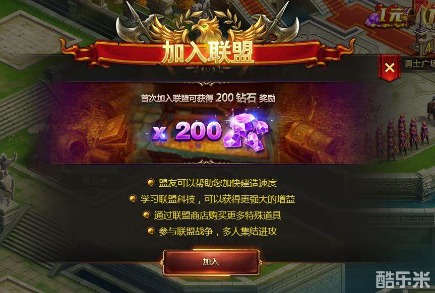 加入联盟还能和小伙伴一起攻占野外的神殿,一同参加联盟战争等功能,不过这些其他功能需要较高等级才能解锁,对新手帮助不大,这里就不一一详细说明了!