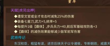 进入到战斗中之后,董卓可以率领前军步兵和后军弓兵开启远近回合的战斗,自身天赋虎兕出柙,一旦遭受到敌方文官或全才类型将领攻击时,受到伤害有25%减免效果。获得专属武器七星刀之后,董卓武力和统帅值将提升,每提升一级霸体技能等级,前方步兵兵力和后方弓兵基础攻防属性都将得到提升。技能霸体减伤效果可以减少受到来自敌方前军伤害。