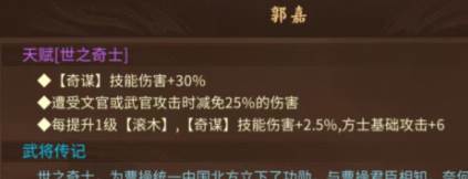 郭嘉属于英豪型武将,在本次测试期间因为没有开放更高等级的角色,所以英豪就已经是最顶级的一批,在属性方面非常强势。即使后期开放了传奇型武将,相信依然能够成为队伍中的主流,所以在各项属性方面,郭嘉完全没有问题。进入战斗后,前军步兵,后军方士,自身天赋世之骑士,使用奇谋技能时伤害提高30%。一旦受到敌方文官或武官攻击,将减免25%受到的伤害。还有一个效果是每提升一级滚木技能等级,则技能奇谋伤害获得提升后,军方士士兵基础攻击力提升。下面和酷乐米小编一起来看看吧
