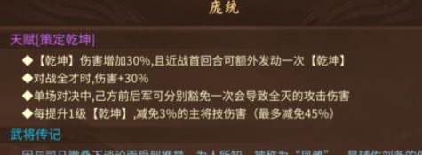 单从此效果判定庞统就有极高价值,重点提升乾坤技能后可以释放两次,在两个回合都有惊人的表现,而且乾坤在多次伤害加成之后,完全能够打出极高爆发。这样一个既有输出,又有额外加成的天赋及技能,是现在很多活动中都需要的种类。第2个效果是在和全才类型将领对战时庞统伤害提高30%,第3个在单场对决战斗中,庞统率领前军和后军都将豁免一次导致阵亡的攻击伤害,最后每提升一级乾坤技能,还将减免受到的敌方主将技伤害。