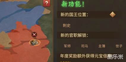 第1个雄踞一方,需要本国国王带领全国上下臣民一起占领建业才能达成,在攻打建业过程中,歼敌数量最多的那一名玩家将会被封为刺史官职,战斗由本国主公发起。封为刺史之后,后面很多官职也会相继解锁,刺史可以将它们分配给其他玩家。包括军师、司马、主簿和世子等官职,全国上下玩家都将获得一份元宝奖励。