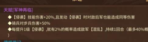 张辽天赋军神再临,使用侵袭技能时伤害获得提升,并且在发动该技能时对于敌方的后军也能造成同等伤害。率领骑兵时对敌方步兵有伤害加成,如果侵袭技能等级提升,还有几率使敌方造成混乱效果。张辽定位也是爆发,只需要围绕着骑兵进行强化,然后再提高一些生存能力,就可以保证打出大量伤害。