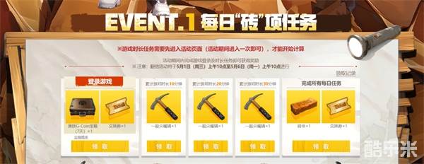 活动期间内登录并达成游戏时长即可获得奖励,登陆即可获得黑铁 G-Coin 宝箱(7天)*1、交换卷 *1;游戏累计时长10分钟/20分钟/30分钟, 各可获得一般尖嘴镐 *1;完成所有每日任务,即可获得砖块 *1、交换卷 *1。