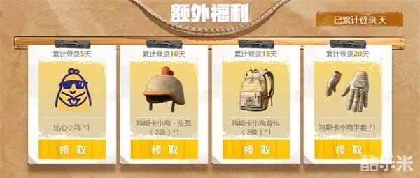 额外福利奖励:累计登陆5天可获得比心小鸡 *1;累计登录 10天可获得鸡斯卡小鸡-头盔(2级)*1;累计登录15天可获得鸡斯卡小鸡背包(2级)*1;累计登录 20天可获得鸡斯卡小鸡手套 *1。