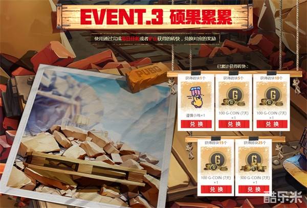 1个砖块就能够兑换一个谨慎小鸡,5个/10个/15个砖块各能兑换一次100 G-COIN(7天)*1,25个砖块则能兑换300 G-COIN(7天)*1。