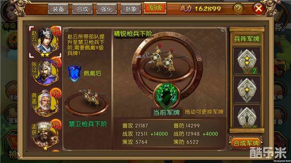 在游戏中通过拖动可以给武将佩戴不同等级的军牌,以此可以为武将增加战攻和战防,从而大幅提升玩家战力,当然,高等级的军牌所带来的提升相当明显。佩戴不同军牌后,武将所带部队的形象也会有不同变化。军牌对战力的提升还是很明显的,所以打血战群英副本是必不可少的。