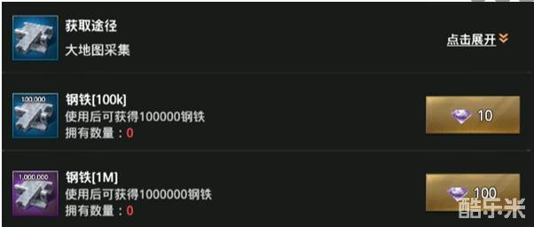 2、钻石购买:10钻石可以购买100000钢铁,100钻石可以购买1000000钢铁。
