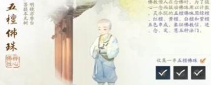 在射雕这款手游中,五檀佛珠是比较特殊的材料道具。这个道具是由灵水院的绿檀、红檀、黄檀、白檀和紫檀五色串成的。需要玩家前往灵水院的净筠位置,去收集这五种颜色檀木,从而来制成这一件道具。下面和酷乐米小编一起来看看吧
