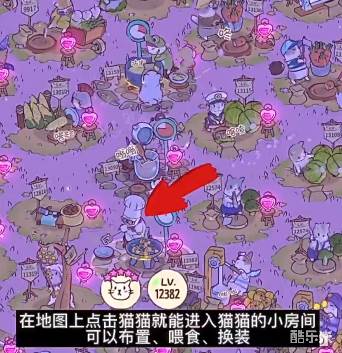 1、首先,玩家们要在地图上面找到猫猫,然后才能进入猫猫的房间,在这里,玩家可以进行布置,喂食、换装等操作。