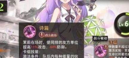 2:茉莉的大招会治疗己方生命比例最低的伙伴,攻击对面生命比例最低的敌人。不像伊贺鸣一样打血最少的,找准时机上场,给队友回血的同时,给对面造成巨额伤害。当队伍里每种能量的伙伴不多于2个时可以触发她的技能,给同一排的队友加上攻击防御buff,行动结束后给生命比例最低的回血。