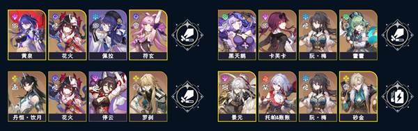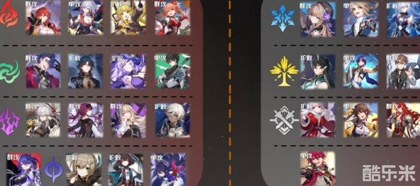 上面是截止当前版本各属性输出角色汇总,同时也标明出了他们的主要攻击类型(群攻、单攻、扩散);在考虑虚构叙事的配队时,可以拿出来与前面的弱点属性表结合比对一下,选择其所在的体系就会自己配队了