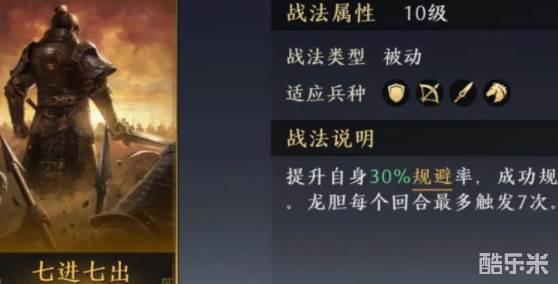 赵云携带战法:七进七出+忘私相助+风卷残云。七进七出作为赵云的特色战法,能够提升自身30%的规避率,成功规避以后触发龙胆被动,尼克对敌军全体造成60%的兵刃伤害,龙胆效果每个回合最多触发7次。七进七出优点就在于这个被动战法发动概率为百分百,虽然额外提供30%规避率,不过可以搭配其他战法与培养角色提升。