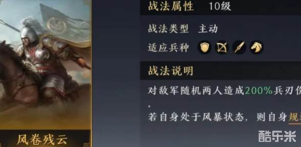最后赵云的战法有两个选择,最优的是风卷残云,如果没有,也可以使用威明显赫作为下位替补。风卷残云是赵云的主要输出手段,尤其是面临高强度阵容,光靠闪避还不够,要快速结束战斗还需要一个高伤战法。风卷残云可以对敌方随机两名,造成200%兵刃伤害,如果目标处于风暴状态,伤害还会提升25%,如果自身处于风暴状态,规避率额外提升10%。