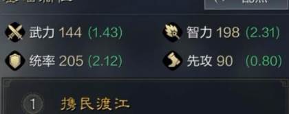 刘备也是目前版本t0的角色,携带战法:携民渡江+百战不殆+铸甲销戈。在这一个天枪阵容里面充当辅助治疗的角色,他的自带战法携民渡江是全队主要恢复手段,也是一个指挥型的战法,效果是战斗开始时,提升16点的统率,加强效果还受刘备的智力值影响。