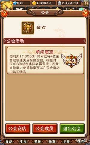 勇闯魔窟就因此诞生了,一个靠消灭BOSS获得荣誉勋章的地方,也可称之为公会BOSS,大家齐心协力消灭那些实力超群的BOSS,然后根据对BOSS的总伤害排名发放荣誉勋章,如果你要问荣誉勋章有什么用?那肯定是买东西啦。
