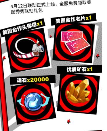全服免费领取美图秀秀联动礼包:美图合作头像框x1、美图合作名片x1、魂石x20000、优质矿石x1