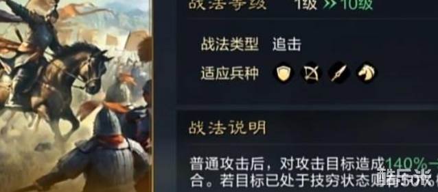 攻其不备,普攻后兵刃伤害附加技穷,对已处于技穷目标50%概率追加震慑。这个战法是目前仅有的追击型硬控战法,有瞬发的技穷,效果简单且粗暴。