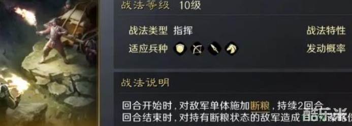 在游戏当中断粮是很多负面状态的一种,可以通过异常状态给敌人兵力降低70%恢复,对于吴国来说断粮是一个十分关键的战法效果,武将可以通过普通攻击对目标造成高额度的谋略伤害效果,而这种操作可以在战斗中持续两个回合,并不断的施加断粮,倘若目标已经处于断粮的状态那么额外伤害还会得到更多的加成。