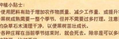 这本书的内容比较基础,就是告诉我们,1、肥料有助于增加作物质量(肥料),减少工作量(保湿土壤),提升农作物产量(这个应该就是生长激素,成熟的时间快了,农作物产量也就提升了),2、果树成熟需要一个月(28天),不需要浇水,但果树周围八格不能有东西,3、作物在属于它们的季节过去后,就会枯萎,除了一些能跨季的作物(你们是否看过很多新手帖子,他们说自己的菜死了,虽然很可怜,但这就是不读书的后果!),4、一些作物需要镰刀收割,种子介绍都会写。