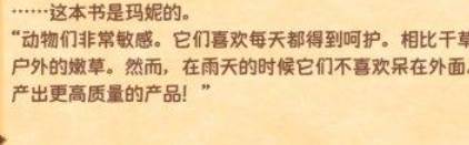 这本书也很基础,就是告诉我们,你每天都要去摸动物,而且动物吃外面的嫩草(把仓门打开让动物出来),增加的比吃干草高,雨天的时候动物不会出来,高的动物产出的产品星级更高!