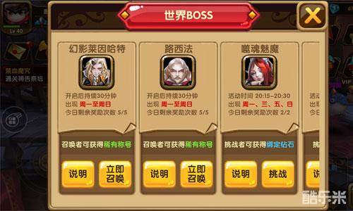 想要在世界BOSS获得更高奖励,首先要留意每个世界BOSS开启时间,并准时进入,因为排名会由你对boss伤害的累积来定夺,如果太晚进去的话,那就算你一次伤害再高,也不够别人长时间累积伤害高。