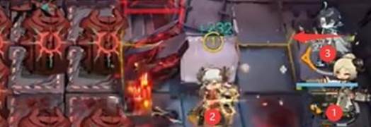 如图所示,开局直接部署【①伊芙利特】向左(需要带德克萨斯+初始费用),随后部署【②塞雷娅】提供阻挡,【③流明】向左提供治疗。