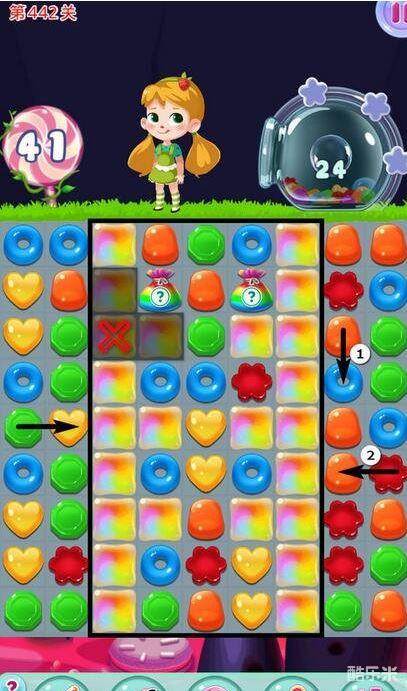 小编心得:本关的重点是对黑框内所有彩虹糖的处理,不尽快处理好它们糖果袋子无法降落,泡泡也无不容易收集。
