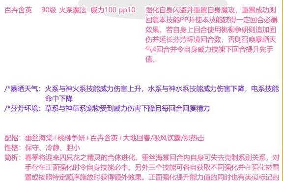 3.春季将迎来四只花之精灵的合体进化。垂丝海棠回合内自身可失去克制系别关系,对手存在正面强化时令自身技能必中。