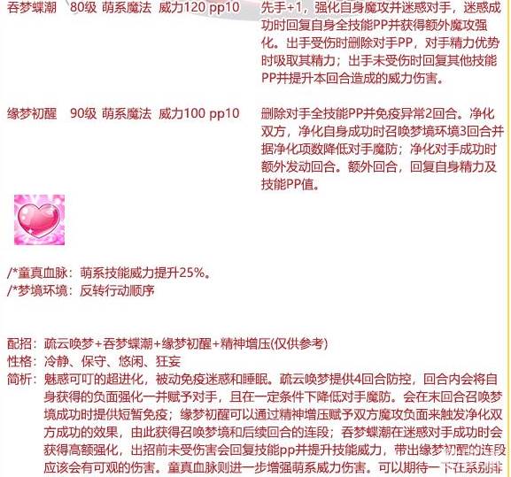 4.会在末回合召唤梦境成功时提供短暂免疫;缘梦初醒可以通过精神增压赋予双方魔攻负面来触发净化双方成功的效果,由此获得召唤梦境和后续回合的连段;吞梦蝶潮在迷惑对手成功时会获得高额强化,出招前未受伤害会回复技能pp并提升技能威力,带出缘梦初醒的连段应该会有可观的伤害。