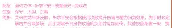 1.洛克王国祈福艾米技能配招:圣佑之体+祈求平安+破魔圣光+变戏法。