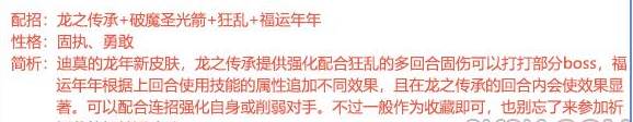 3.迪莫的龙年新皮肤,龙之传承提供强化配合狂乱的多回合固伤可以打打部分boss,福运年年根据上回合使用技能的属性追加不同效果,且在龙之传承的回合内会使效果显著。