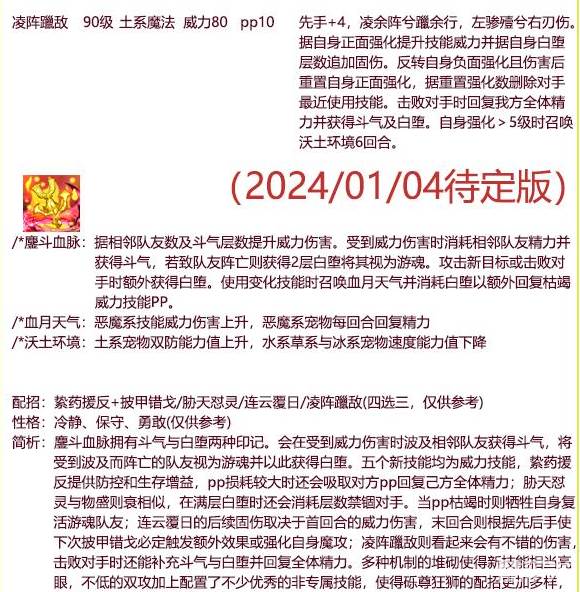 4.五个新技能均为威力技能,龄药援反提供防控和生存增益,pp损耗较大时还会吸取对方pp回复己方全体精力; 胁天怼灵与物盛则衰相似,在满层白堕时还会消耗层数禁锢对手。